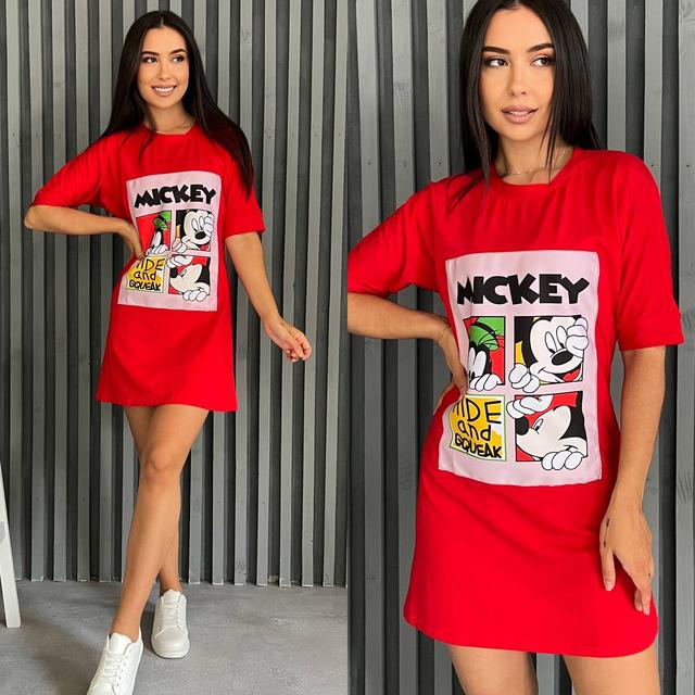 Коротке плаття футболка прямого крою з рукавом до ліктя та принтом мікі ( р. 42-50) 52035279