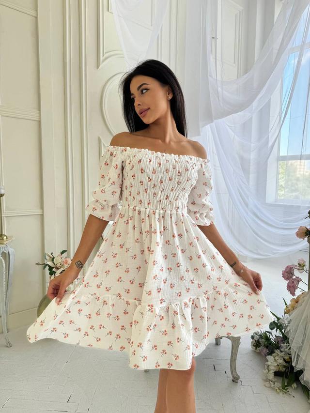 Муслінова сукня з відкритими плечима та резинкою на грудях зі спущеними рукавами (р. 42-52) 2035771