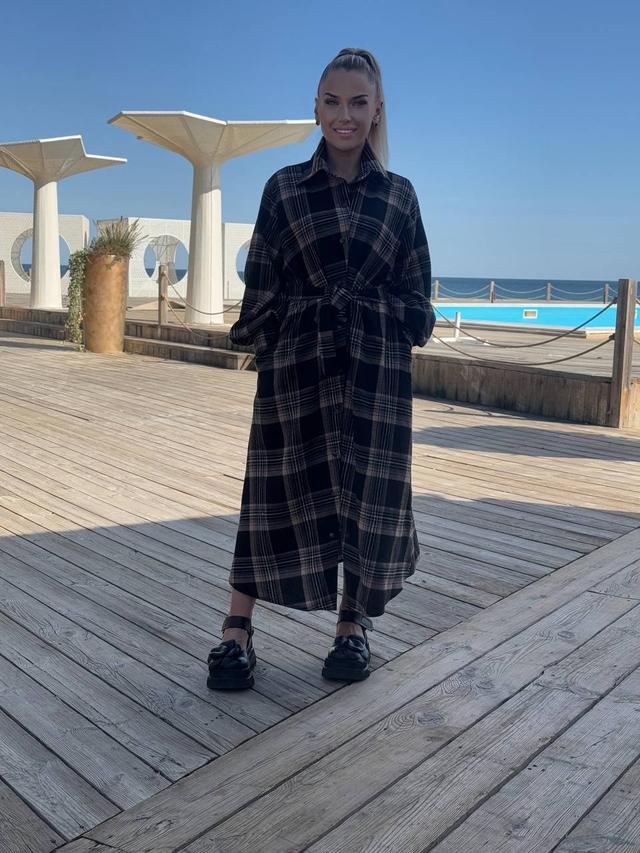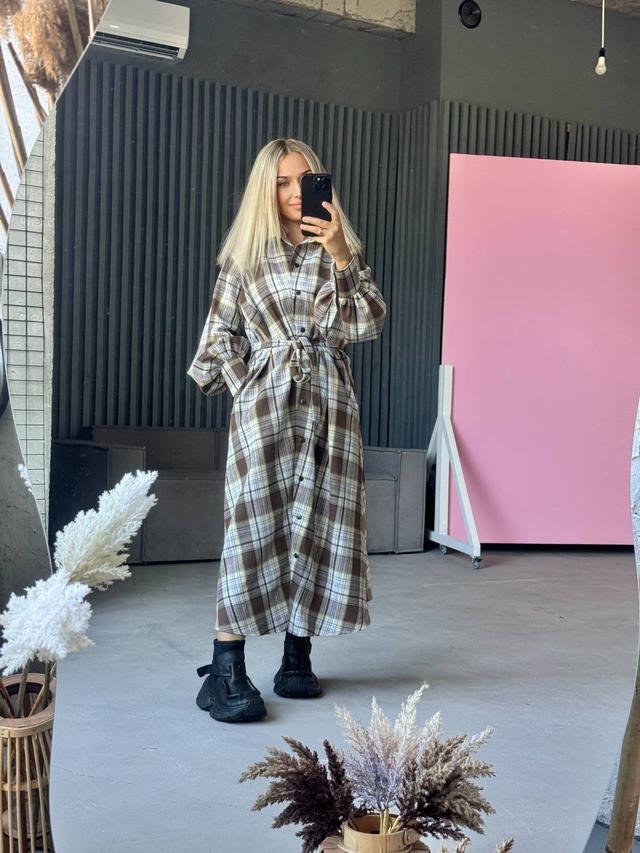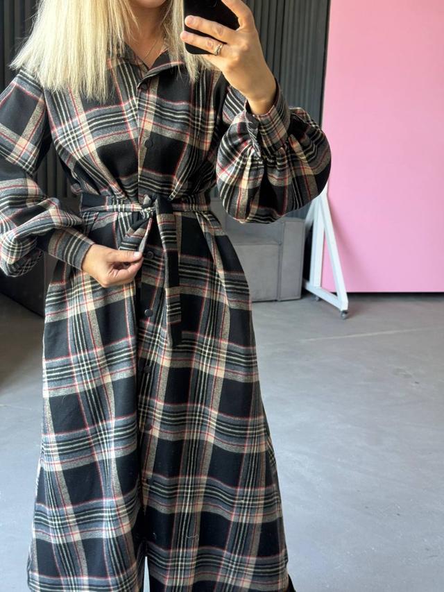 Жіноче тепле плаття-сорочка довге картате з поясом і рукавами ліхтариками (р. 42-52)