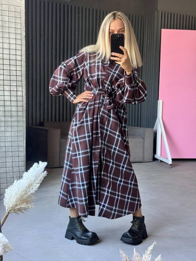 Жіноче тепле плаття-сорочка довге картате з поясом і рукавами ліхтариками (р. 42-52) 2py6141